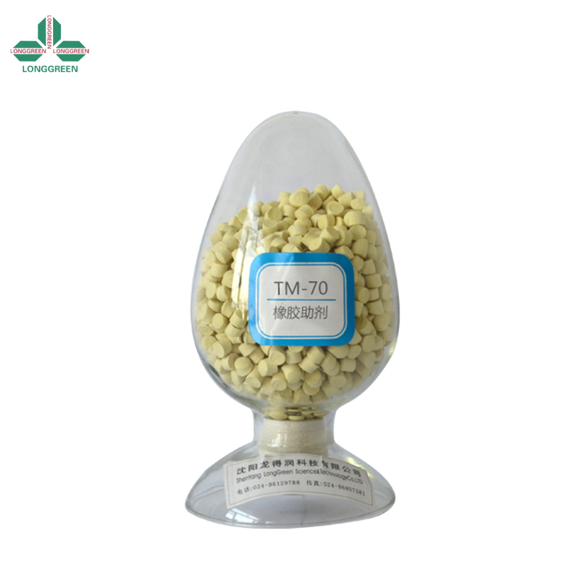 The product Longgreen TM-70 is an effective vulcanizing agent for halogen-containing rubbers such as CO, ECO and CIIR, BIIR, as well as a vulcanizing agent for ACM rubber and a co-vulcanizing agent for NBR/PVC blended elastomers. Compounds containing Longgreen TM-70 tend to scorch, so the post-compound treatment time should not be too long. In order to improve the storage stability of the compound containing Longgreen TM-70, CTP-80, a pre-dispersion and anti-scorch agent, can be added to the formula. In addition, the product has a tendency to increase the bond strength of rubber to metal. The product must be stored in a cool dry condition, and according to the recipe, the storage time should not exceed one week.