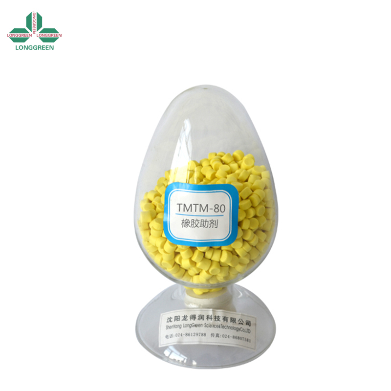 Longgreen TMTM-80 has a very fast vulcanization rate and good scorch safety when used in natural rubber and synthetic rubber. It can accept additional activation from basic accelerators (eg: aldehydic accelerators, amine groups). Combined As with sulfonamide and sulfhydryl-containing accelerators, Longgreen TMTM-80 is used as a secondary accelerator of great technical importance. Low vulcanizates provide good aging resistance with vulcanizates.